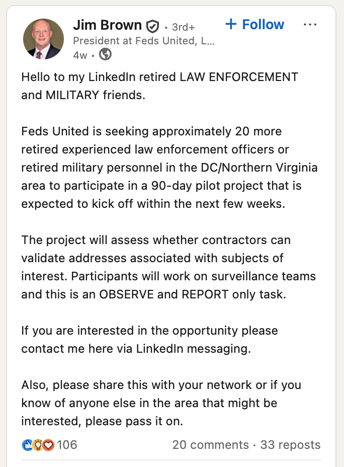 In a LinkedIn post in October, Jim Brown, president of government contractor consultant Feds United and a former longtime senior ICE official, said he was looking for retired law enforcement or military personnel for an upcoming project.