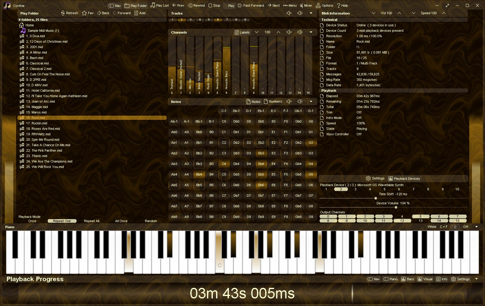 play list. Adjust playback speed, volume and output device on-the-fly during playback. A large playback progress bar makes jumping forward and backward in time a breeze with just a single click or tap. Supports ".mid", ".midi" and ".rmi" files in format 0 (single track) and format 1 (multi-track). Comes complete with 25 sample midis ready to play.